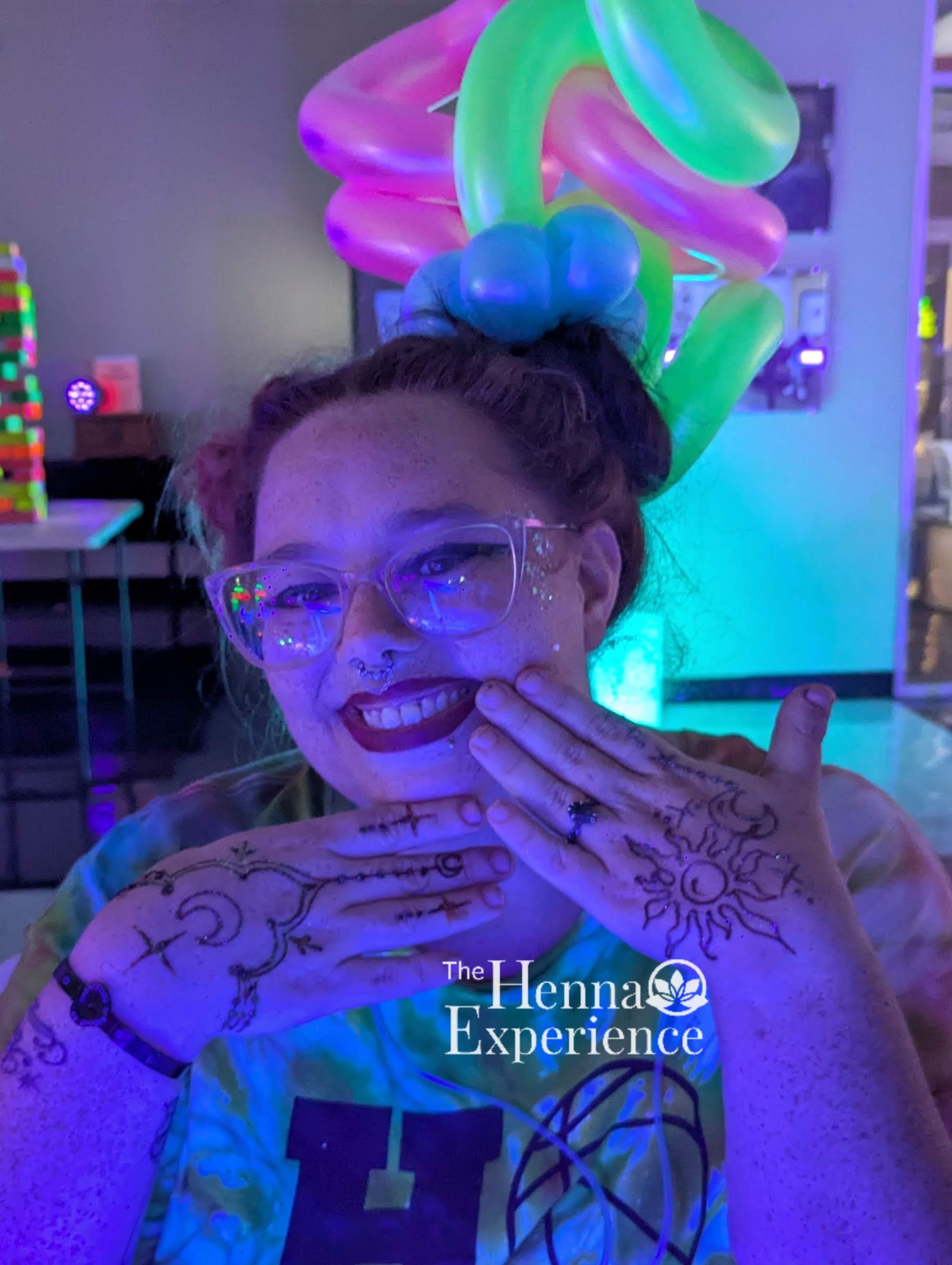 This is hand-drawn, custom henna elevated with cosmetic-grade UV reactive glitter that glows brilliantly under black light. Students leave with a design that shines during the event and develops into a rich henna stain that lasts 1 to 2 weeks after.